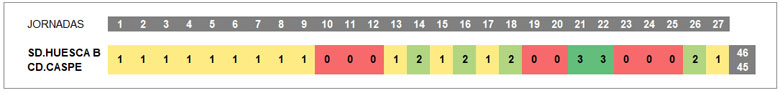 Y la realidad imprime un cierto halo de afinidad entre ambos contendientes. SD.Huesca y CD.Caspe han seguido rutas paralelas esta temporada. En ninguna de las veintisiete jornadas disputadas han estado a más de tres puntos de separación en la tabla, ocho semanas han compartido idéntico número de puntos y hasta en trece, solo les ha separado un punto en la clasificación.